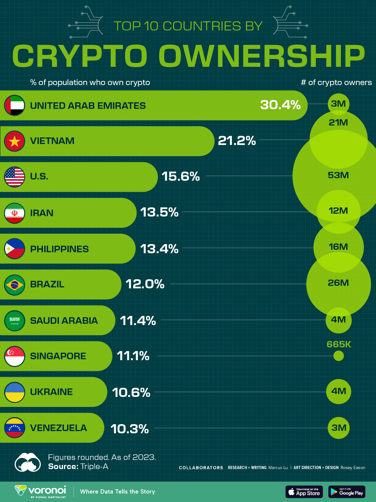 Top 10 countries with the largest percentage of people owning cryptocurrency in the world. Source: Triple-A